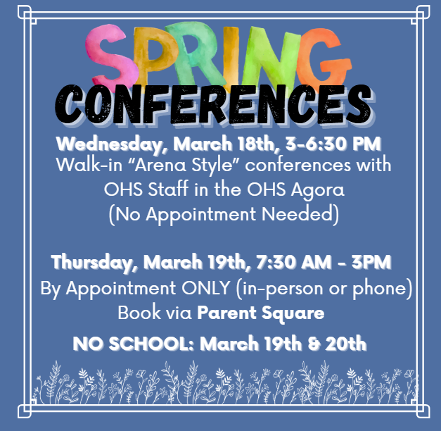 Spring Conferences are just around the corner! Wednesday, March 18 we have Walk In "Arena Style" conferences in the Agora. No appointment necessary, just pop in and find your teachers! 3-6:30 PM. T...